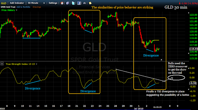 We notice that price is currently behaving in a manner curiously similar to a multi-day patch of time beginning 8 sessions ago. There appear to be two prior instances when a divergence of GLD price with respect to the True Strength Index indicator preceded a run up in price. Perhaps the current divergence in place signals a bottom, as before. The trend line of the TSI has not yet broken out to the upside, so the jury is still out on how this will be resolved. But the clues look very favorable for GLD having bottomed today.