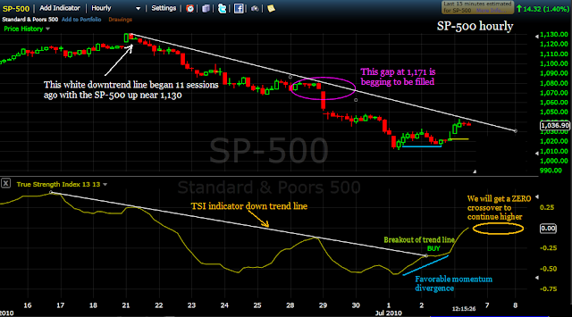 The exact midpoint of this SP-500 down leg is around 1,071 where we conveniently find an open gap that is begging to be filled. Price today rallied up to the white trend line and has since been repelled lower. It would be easy to conclude, at this moment, that the stock market will continue to fall apart except that the True Strength Index indicator is suggesting something quite different.