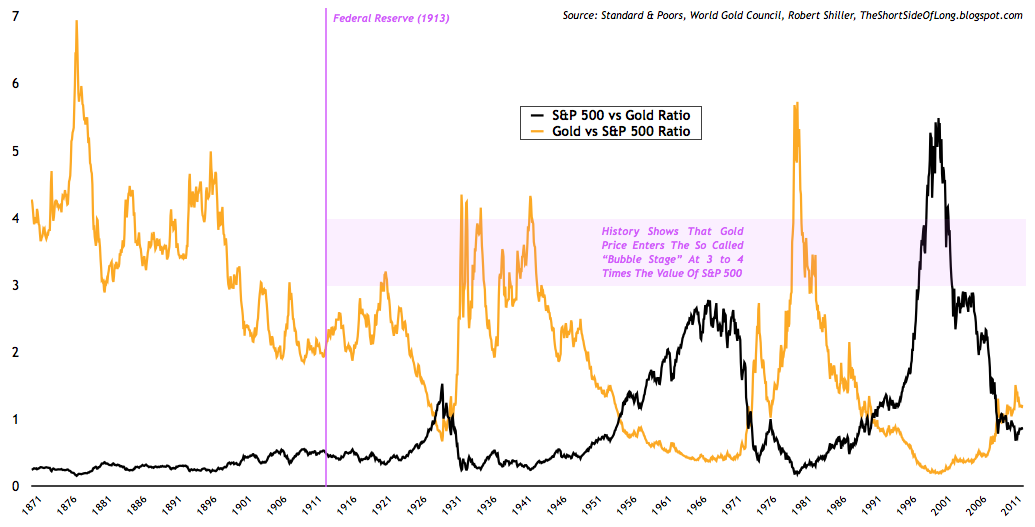 Moving away from Gold’s valuation linked with the monetary base, we turn to valuing Gold relative to other financial assets such as stocks. Personally, this is a much more preferred measure, because market participants buy and sell these assets everyday (free market). In the chart above, we can see how Gold and the Dow Jones Industrial performed in nominal price during the 1970s. While equities stayed flat for more than a decade, Gold entered a “mania phase” in the latter parts of the 1970s and then went parabolic into 1979, and finally touching the nominal value of the Dow Jones in the early parts of 1980.