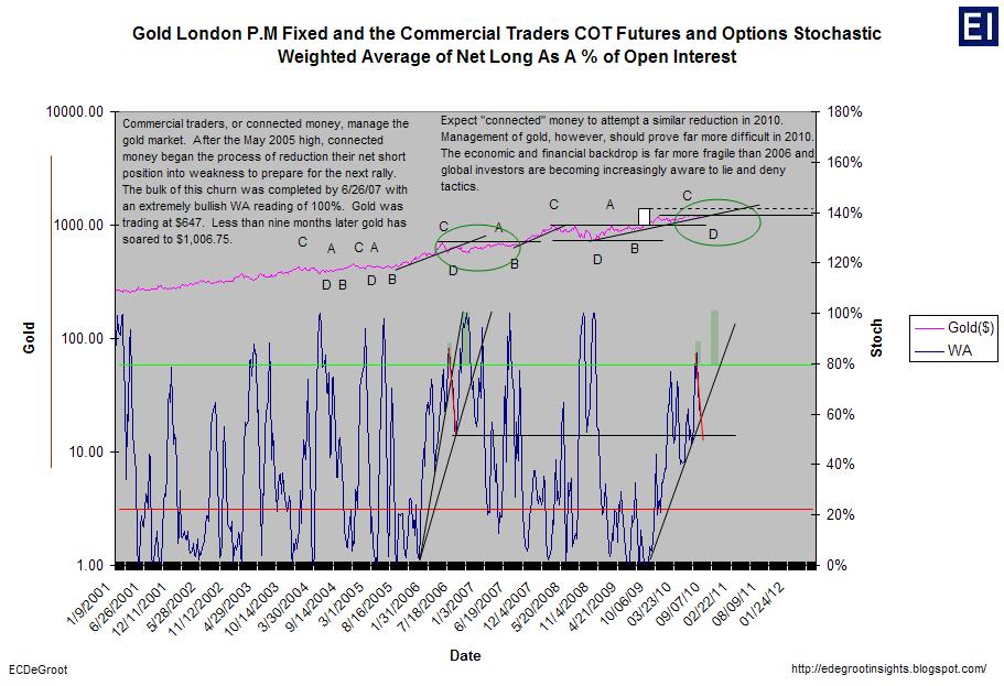 Gold London P.M Fixed and the Commercial Traders COT Futures and Options Stochastic Weighted Average of Net Long As A % of Open Interest