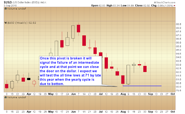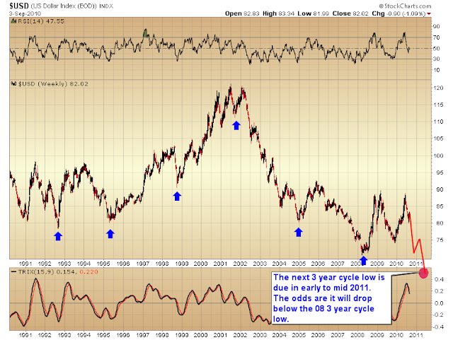 The only way to abort this from happening is for Bernanke to immediately start withdrawing massive amounts of liquidity from the market. That won’t stop the 3 year cycle from coming but we might have hope that the dollar could hold above the all time lows and we might avert or at least reduce the damage that will be caused by the impending currency collapse.