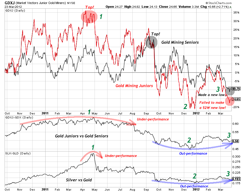 - Gold Mining Juniors top in April 2011, ahead of Gold Mining Seniors, which topped later in September 2011. At the same time, Juniors relative strength was rolling over, while in May Silver crashed and its relative strength against Gold entered downtrend. All this spoke of further selling in an upcoming cyclical bear market.