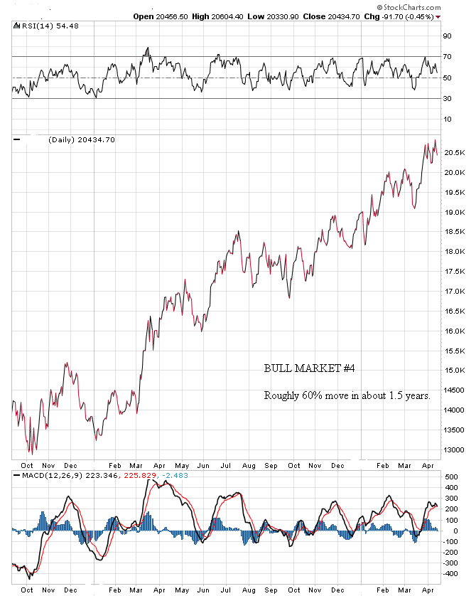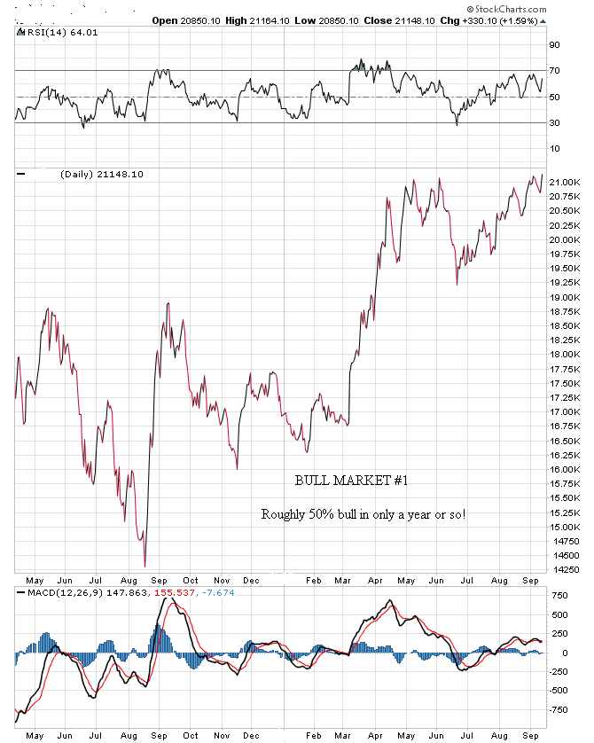 Though it may seem as though paperbugs are winning again because turkeys in the general stock market are flying higher than Gold and Gold stocks, this is a short term phenomenon. Gold bulls need to remember to stay focused on the longer term. For your interest and entertainment, I am going to show you a series of powerful bull markets, one right after the other, to prove a point. I have deleted the identifying information and year that these bull markets occurred, but the following charts represent the actual price action in several historical bull markets. Please bear with me as you briefly peruse the following seven charts: