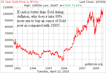Think you could have played these swings using technical analysis and captured a good chunk of each of these cyclical bull markets to make it a profitable secular bear market? Maybe you’re right, but maybe not. Wouldn’t it have been better to just stay in cash? In Japan we have the only example of a major economy and stock market undergoing a secular economic depression since the day when Nixon broke the final link between the international monetary system and Gold in 1971. So, has the Yen been a better bet than Gold over this time period since cash is king during deflation? ABSOLUTELY NOT! Granted, it took Gold a while to catch up to the Yen, as the global Gold market was mired in a secular bear market during the 1990s. However, here is a chart of Gold priced in Japanese Yen from 1990 thru today (chart courtesy of goldprice.org):