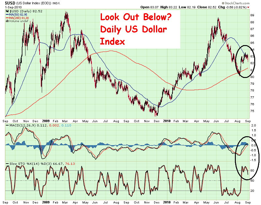 As you can see, the dollar dropped down to its 200 dma in early August, accompanied by a very “oversold” reading on the technical indicators. A bounce was to be expected. But what has been unexpected is what appears to be the brevity of this trading bounce. At this point it looks like the next move is for the dollar to sell off down its 200 dma and that will be a key “test” level. That should occur in the high 81 area.