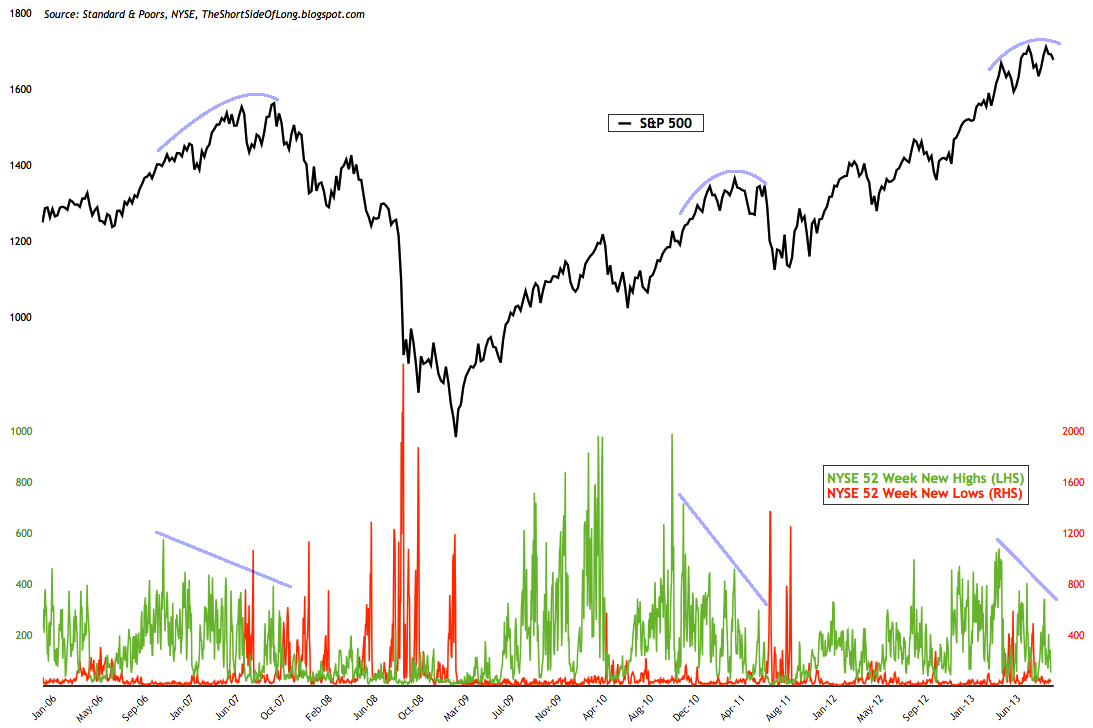 While the S&P 500 has been making all time new highs in recent months, the internals of the stock market index suggest a different picture. The chart above shows that the NYSE number of stocks making new highs decreasing at every new marginal high the market made, indicating that the rally is running out of fuel. Similar occurrence were seen at the 2007 and 2011 tops.