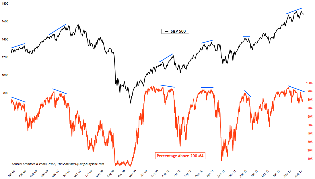 As we know, near market peaks, certain stocks tend to start breaking down before the overall index turns down too. This indicator is a perfect example of that happening, whether it was intermediate peaks in April 2012 and October 2012; or whether it is major peak in early to mid part of 2011. Are we looking at another major peak? bearish divergence has been going on for several months now, so pay close attention.