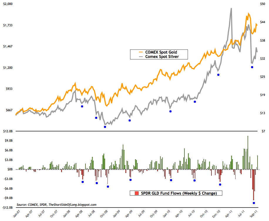I tend to use GLD weekly dollar change fund flows for both Gold and Silver. I do have data from other ETFs including SLV flows, but it does not work anywhere as good. Besides, Gold and Silver have an amazingly high correlation, so it is pretty useful for both assets. Looking at the chart above, coming into late September, GLD suffered a record weekly outflow two weeks in the row. This was a selling climax or a panic or fear or whatever you want to call it. Previous outflows only half of the recent amount have resulted in intermediate bottoms, so it is safe to assume this time will not be different. We could be in for one more sell off for a retest of lows. If that happens, jump in with both hands and feet against the crowd!