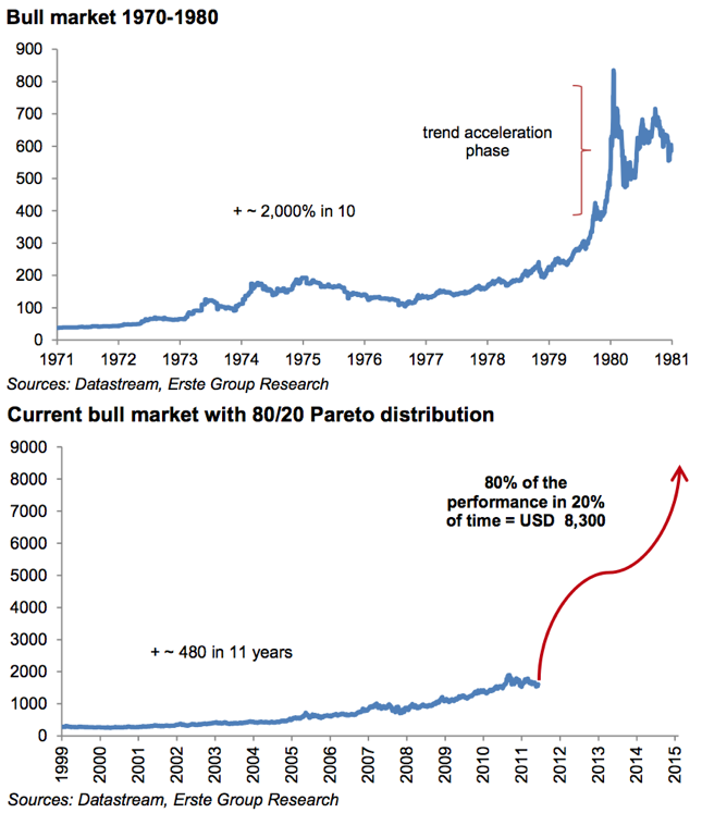 The chart above explains that quote from the report rather well. If the price action was to track the Pareto distribution, or also known as the 80/20 rule, then we could expect some serious Gold movements in the coming months, quarters and years as we witness a fast parabolic movement towards the sky (and much higher). In the last several years of this secular bull market, Gold could accelerate rather quickly and approximately hit a target of $8,000 per ounce or even higher, according to the chart above.