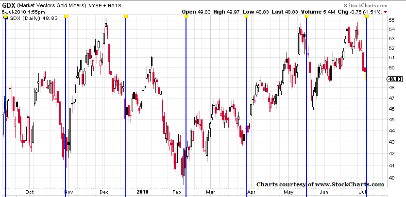 I pulled the tool across the GDX chart, creating blue parallel lines equidistant one from the other, and nearly could not believe my eyes. Plain as day, there were the cycles of GDX. Sometimes a cycle bottoms a few days early, sometimes a few days late. But after the cycle bottomed price always exploded higher. Could it be that our recent horrible red candles are occurring right on schedule and about to turn into white candles exploding higher and higher?