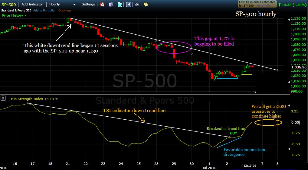 The exact midpoint of this SP-500 down leg is around 1,071 where we conveniently find an open gap that is begging to be filled. Price today rallied up to the white trend line and has since been repelled lower. It would be easy to conclude, at this moment, that the stock market will continue to fall apart except that the True Strength Index indicator is suggesting something quite different.